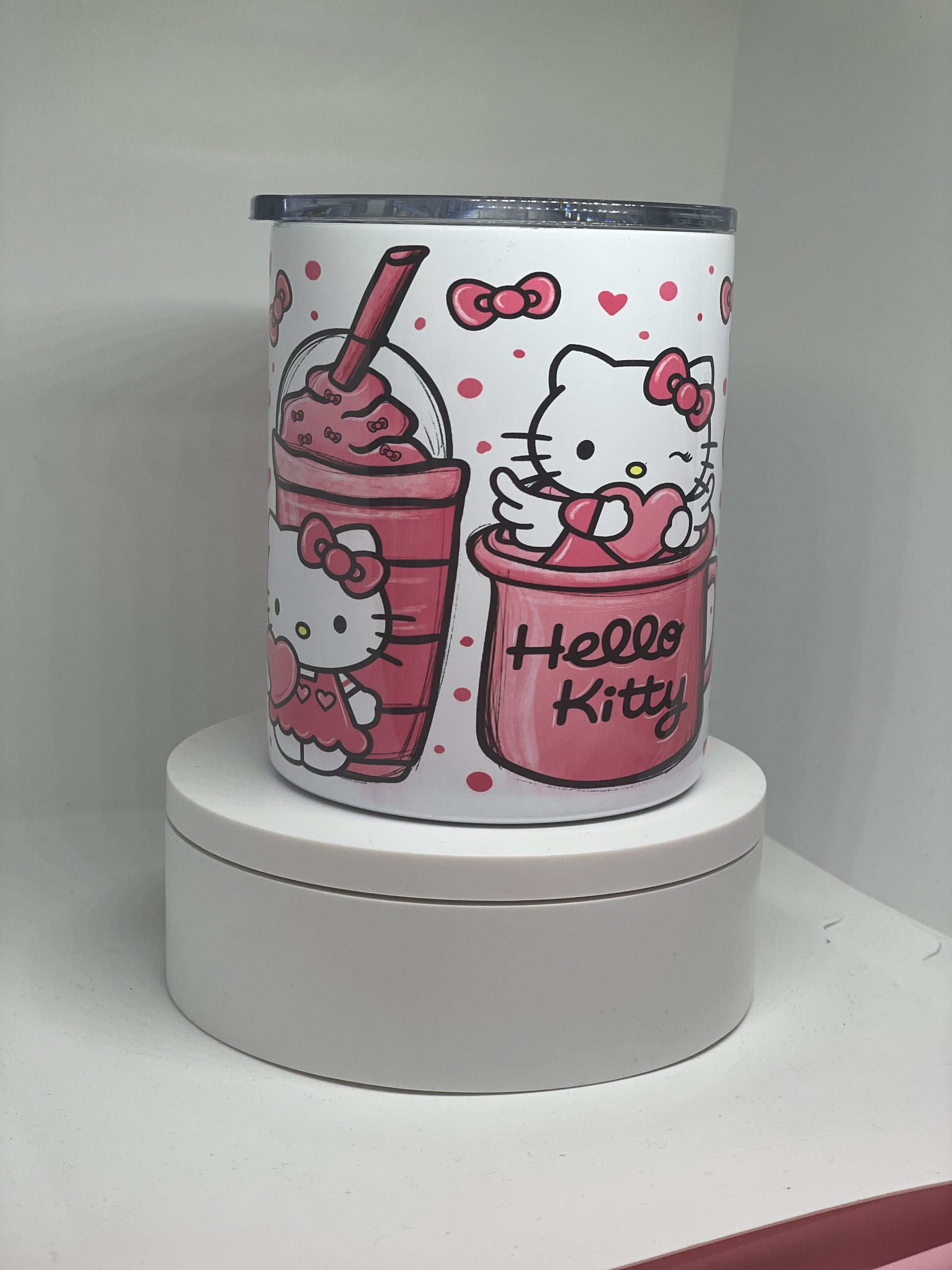 This 10 oz Hello Kitty tumbler is crafted with vibrant pink hearts, making it a charming and adorable addition to your cup collection.